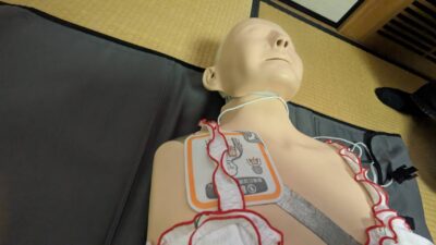 京都橘大学FASTのAEDの使い方レクチャーでは、女性にAEDを使う際は「下着やネックレスはつけたままでもいいけどAEDパットは下に。決して重ならないように。」と教えていただきました。
